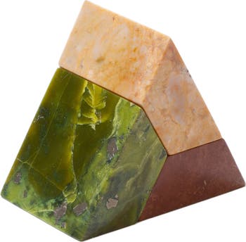 Introducing playful geometry into home décor, this large sculptural puzzle solves to form a triangle, or stacks in multiple playful ways. Carved from 3 unique Andean gemstones. The 3 piece triangle from DAR Proyectos can stack and play in multiple angles, and the weight of the gemstones is a grounding practice to turn and sculpt with your hands. This sculptural piece is a powerful object to decorate any home or office space. Available in a combination of 3 colours: serpentine green, creamy soapstone and red jasper, each piece is unique one batch from the next.