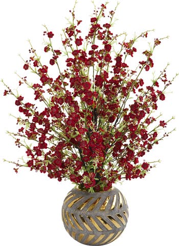 Incorporate hints of the countryside throughout your home with this cheerful, artificial arrangement flaunting a delicate collection of cherry blossom sprays, each made up of intricate silk flowers in bright, fresh color and enhanced with complementary greenery. Standing 30in. high from a gold trimmed stoneware vase, this effortless arrangement would easily beautify a lady s bedroom or bathroom.