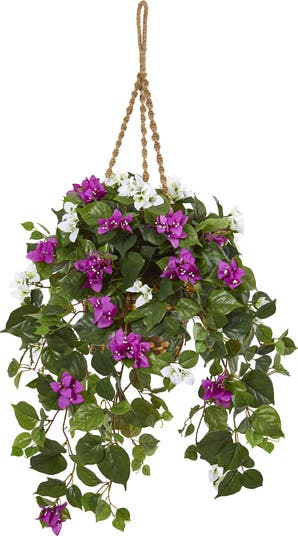 Coming in a decorative hanging basket, this bougainvillea artificial plant has beautiful, lifelike purple and white flowers that are intertwined with realistic green leaves. The natural appeal of the piece will add some much-needed life into your space. Hang it in your enclosed sun room for a touch of nature.