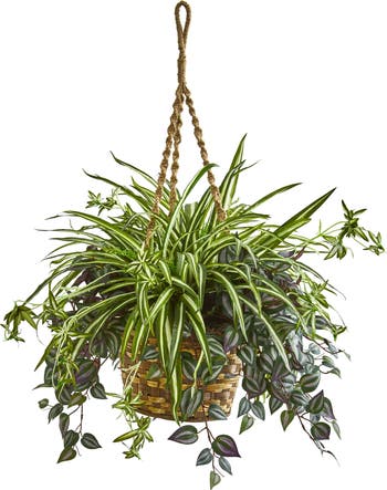 Regal dark purple blooms accent the slightly variegated green foliage with this artificial wandering Jew and spider plant. With a hanging basket included, the stunning dense greenery of this piece drapes downward over the side of the basket. Bring this elegant piece into your reading nook or bedroom, allowing it to fill in any empty spaces in your setup. Or, it can be hung behind your favorite chair for a beautiful finish.