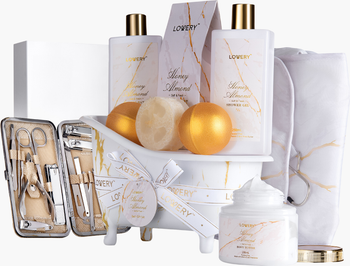 Deluxe 31 piece bath gifts: each gift basket contains premium bath and shower essentials: shower gel, bubble bath, body butter, bath salt, organic loofah soap, 2 x extra large 24karate gold bath bombs, big toiletry bag with hanger and multiple zippered pockets, 21 piece nail kit wrapped in a marbleized tub with a ribbon and hangtag for easy gifting.