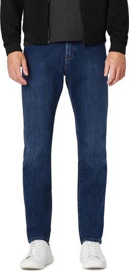 A dark wash styles classic jeans cut from sleek stretch denim in a relaxed, straight-leg silhouette.
