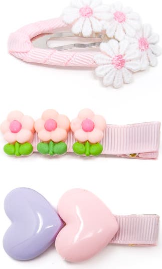 A sweet mix of hearts and florals in every clip! This playful set pairs embroidered daisies, colorful blooms, and glossy heart barrettes for a bright and cheerful style that adds a fun pop to any hair day. Includes 3 hair clips per set Features hearts, daisies, and pastel flowers Fun and bright color palette Made in Korea Size: 2.1" - 2.2" (5.3 - 5.5 cm)