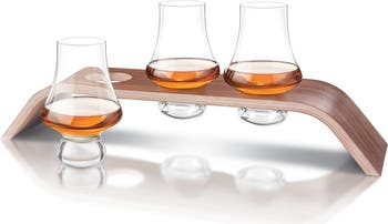 Sip your favourite whiskey, scotch or any other liquor from these 100% lead-free crystal glasses. The walnut wood levitation stand with aspen wood veneer elevates glasses, providing more precise filling and viewing. Place glass onto side and gently roll, to create a natural liquid motion increasing the nosing of aromas. Set includes 3 tasting glasses wood levitation stand. Ideal for tasting 1-2 oz (30-60 ml).