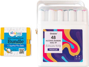 Brighten your day with this cheerful 5-pack bundle with all our best mini adult coloring books in a beautiful keeper box complete with 48 colored alcohol markers.. Filled with hand-drawn illustrations and uplifting designs, each book offers a moment of calm, creativity, and color—anytime, anywhere. Compact and gift-ready, they’re perfect for on-the-go fun, desk drawer escapes, or thoughtful pick-me-ups.