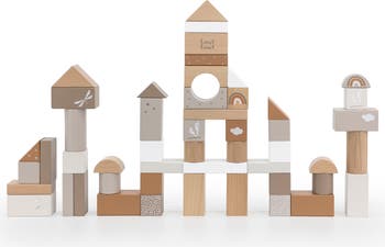 LABEL LABEL: WOODEN BLOCKS 50PCS - TAN - The Label Label Wooden Blocks set is thoughtfully crafted from high-quality, FSC-certified beech wood, ensuring both durability and sustainability. This 50-piece set includes a combination of natural wooden blocks and colorful blocks, each painted with child-safe, water-based paints in soothing nougat, white, and grey shades. These pastel colors and smooth finishes make the blocks both visually appealing and safe for young children. Each block in the set features various shapes, sizes, symbols, and patterns, offering endless possibilities for building, stacking, and imaginative play. The blocks come neatly packaged in a convenient storage box with a handle, making them easy to store and carry for playtime at home or on the go. Additionally, the set includes a booklet with creative building ideas to inspire your child s imagination and encourage creative problem-solving. As children build and stack with the blocks, they develop fine motor skills, spatial awareness, and hand-eye coordination. The open-ended nature of the set also stimulates creativity and helps strengthen cognitive abilities as kids explore different ways to arrange and combine the blocks. Ideal for toddlers and children ages 2 and up, the Label Label Wooden Blocks set is the perfect addition to any playroom, promoting hours of educational fun and imaginative development. INCLUDES: 50 wooden blocks that store away in the included box.
