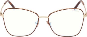 T-shaped motifs accent the butterfly silhouette of Italian-made glasses fitted with lenses that help filter out blue light from devices and computer screens.