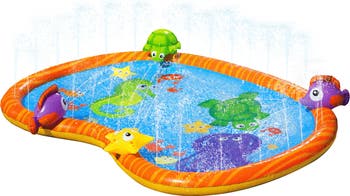 The Sprinkle N Splash Play Mat is the perfect way to introduce your child to water play! Gentle water sprays come from the squishy water-filled border and fill the shallow pool with water, providing just enough splash for your toddler! Fun ocean characters will bring smiles and keep your little one entertained all summer long!