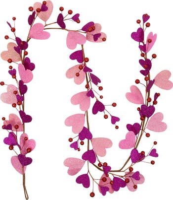 Set the stage for a memorable and enchanting Valentine s Day with our glitter heart garland. This charming garland is the perfect addition to your Valentine s Day decor, showcasing a delightful combination of pink and purple hearts intertwined delicate berries. Its unlit design allows for customization, giving you the freedom to add your own personal touch with string lights or other decorative elements. Product Features: Valentine s Day heart garland Pink and purple hued hearts Accented with glitter and red berries Bendable wire center allows for you to shape the garland any way you desire Hooks on each end for easy hanging Recommended for indoor use - if using outdoors place under a covered area Dimensions: 6 long x 2.75" wide Material(s): plastic/paper/wire/foam/glitter