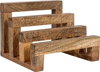 - Beautifully crafted mango wood stand features three sections, providing a stylish and organized display for cutting boards
