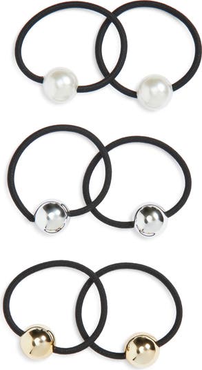 Polished ball embellishments accent these elastic hair ties designed to secure ponytails and buns with understated polish.