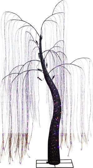 Make it an elegant spooky night with the pre-lit artificial Halloween black willow tree. Inspired by the gothic charm and the mysterious allure of the willow trees, create your own haunted house and watch as this statement piece does all the talking. Crafted from high-quality materials, you ll notice the curving slender black trunk silhouette that supports bendable branches. Nestled between the long branches are 600 LED purple and orange dual color lights with 3 functions to control their appearance. Standing 7-Ft from a sturdy base, display this sophisticate piece in any room that needs a showstopper. Perfect for Halloween parties, haunted house events, or as a stunning seasonal centerpiece that elevates your autumn décor beyond typical orange and black colors.
