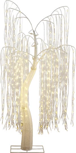 Make it an elegant holiday night with the artificial white willow tree. Inspired by the gothic charm and the mysterious allure of the willow trees, create your own haunted house and watch as this statement piece does all the talking. Crafted from high-quality materials, you ll notice the curving slender white trunk silhouette that supports bendable branches while the light hue softens the look. Nestled between the long branches are 400 LED cool white lights. Standing 7-Ft from a sturdy base, display this sophisticate piece in any room that needs a showstopper. Perfect for Halloween parties, haunted house events, or as a stunning seasonal centerpiece that elevates your autumn décor beyond typical orange and black colors.