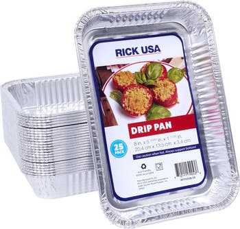 RICKUSA "8X5" EXTRA HEAVY-DUTY DISPOSABLE DRIP PANS (25-PACK) - Crafted from durable, high-grade aluminum with reinforced walls, these pans deliver exceptional sturdiness. Precise embossing that enhances structural integrity. Adding more side wall grooves for increased stability. Convenient Disposable Design: No need to worry about cleanup - simply toss these pans in the recycling bin after use, making them ideal for parties, camping, picnics, and everyday grilling and baking. Superior Aluminum Foil Drip Pans: Made from premium quality aluminum foil, our drips are earth conscious and recyclable. Our drip pans are specially designed to keep your grill nice and clean while grease free! Heat Conducive: Our replacement aluminum trays have high thermal conductivity, allowing them to handle extremely high temperatures for oven or grill use. Versatile: Use our drip pans for catching grease, prepping meals, baking food, storing leftovers, or even packing food to go! Don’t worry about cleaning up, just toss them when you’re done! Perfect for barbecues, picnics, parties, dinners, and more! OVERVIEW: Aluminum foil pans. Recyclable. Disposable. Cooking. Baking. Leftovers. Heating Food. Food Prep. SAFE FOR: oven, freezer, cooktop, dishwasher, grill.