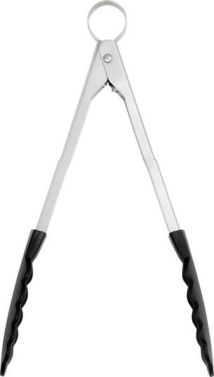 Cuisipro Silicone Locking 9.5 Inch Tongs are designed for precision and control. Designed to handle both cooking and serving tasks with ease. Easily open and close these tongs by pushing to open, or pulling to close, on the patented locking mechanism. The tongs feature a loop for hanging, or easily store in your utensil drawer.