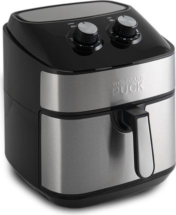 Add an air fryer to your kitchen collection with Wolfgang Puck’s 9.7QT Stainless Steel Air Fryer. The fast convection cooking and large, single basket design allows you to cook for your entire family. Simply add your favorite foods, set the time and temperature dials, and wait for your food to be ready. Once the time is complete, your air fryer will automatically turn off to prevent over-cooking, so your food is perfect every time! When you’re finished, the nonstick interior is easy to clean, and messes can typically be wiped away. The unit is compact, and the stainless-steel design looks great in every kitchen allowing you to easily store it under your cabinets. Enjoy your fried favorites with less oil and calories using Wolfgang Puck’s Family-Sized Air Fryer! Features Benefits: Family-Sized Air Fryer - Cooks a whole chicken. Simple, Dial Controls - Cooks up to 60 Minutes, Heats up to 400oF. Versatile Cooking Options. Easy-to-Clean Interior. Included Cooking Guide Recipes.