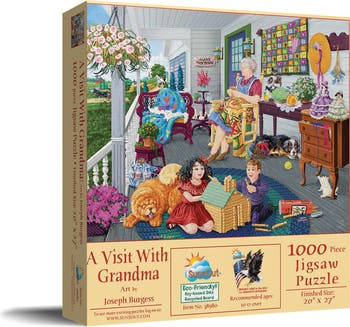 Immerse yourself in the heartwarming scene depicted in "A Visit to Grandma s," a 1000-piece jigsaw puzzle by SunsOut Inc. Beautifully designed by artist Joseph Burgess, this puzzle measures 20" x 27" when completed, embodying more than just a memento, but a journey back to cherished family moments and cozy afternoons. This puzzle isn t only captivating but is a representation of ultimate craftsmanship and durability. SunsOut Inc. offers interlocking pieces made from recycled cardboard in the USA, providing a perfect fit with a frustration-free, satisfying puzzling experience and exceptional durability. The brand s dedication to eco-consciousness elevates this activity, using soy-based inks and precision die-cut recycled materials for a stylish, sustainable choice. All SunsOut puzzles come with a customer-first guarantee, assuring quality control, a worry-free warranty, and prompt resolution for any issues related to missing or damaged pieces. As an eco-friendly, woman-owned small business made in the USA, SunsOut showcases American craftsmanship and commends local small businesses with a puzzle that is as delightfully assembled as it is to complete.