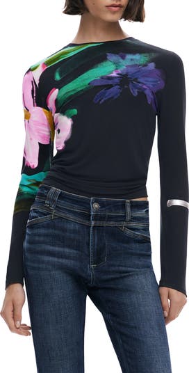 A dreamy floral graphic pops against a black background on this long-sleeve T-shirt cut from a stretch-enhanced knit that s so soft and comfortable it won t have time to migrate to the bottom of your stack.