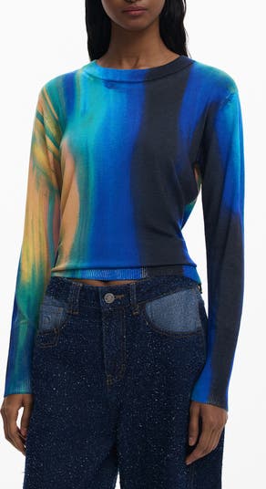 A modern-art inspired design shades a trim crewneck sweater fashioned from a fine-gauge knit.