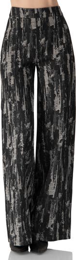 - Modern wide-leg jeans featuring an abstract brushstroke print in black and gray tones.