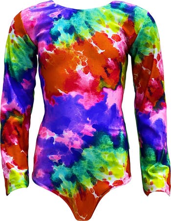 Dive into a wearable explosion of color with this electrifying one-piece swimsuit. This suit is a true work of art, featuring a psychedelic, all-over tie-dye print that bursts with vibrant shades of purple, blue, green, and fiery orange. The sleek, long-sleeve silhouette offers a sporty-chic look while providing excellent coverage and added sun protection.