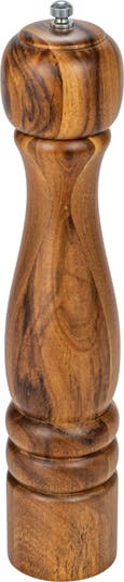 - A sleek and stylish acacia wood salt and pepper mill that has a metal grinder, giving it a smooth and durable performance
