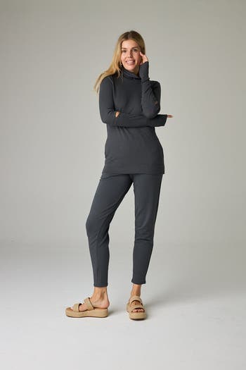 - Modern crew-mock neck, Signature front split sleeves, Side pockets