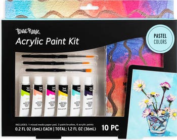 ACRYLIC PAINT KIT: PASTEL - Transform your creative vision into reality with the Brea Reese Acrylic Paint Kit in Pastel Colors. This thoughtfully curated kit includes 6 soft, blend-able paints (mint, peach, pink, pale yellow, ocean green, lavender), 3 high-quality paintbrushes, and a pad of mixed-media paper to get you started. The gentle, muted tones of this set are perfect for creating delicate landscapes, floral art, or sophisticated modern pieces. Crafted for ease of use, the paints offer rich pigmentation and a smooth, creamy consistency, ensuring beautiful, professional-quality results every time. The formula meets ASTM D-4236 standards for worry-free creativity, making it safe and non-toxic. Designed for long-lasting vibrancy, these richly pigmented paints ensure your artwork remains bold and beautiful over time. Ideal for both beginners and experienced artists, this kit provides all the essential tools needed to experiment with pastel hues and develop new techniques. The quick-drying formula allows for effortless layering and blending, making it easy to achieve soft gradients and subtle transitions in your artwork. Whether you re painting at home, in the studio, or on the go, this set offers convenience and professional-quality performance in one compact package. INCLUDES: 1 Mixed Media Paper Pad, 3 Paint Brushes, and 6 Acrylic Paint Tubes.