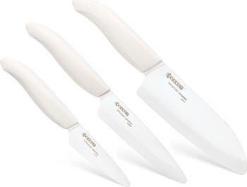- 3-piece ceramic knife set includes 5.5" Santoku Knife, 4.5" Utility Knife, and 3" Paring Knife