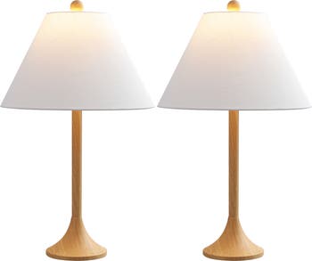 This set of two modern lamps combines clean lines and warm colors for a relaxed, coastal vibe. It features a sturdy metal column base with an angled hardback linen shade. An ideal pair for the bedroom, living room or home office, these lamps include an LED bulb for bright, warm lighting.