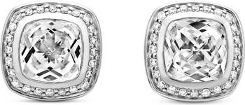 Sterling silver. Faceted prasiolite, 2.70 total carat weight. Pavé diamonds, 0.25 total carat weight. Earring, 11x11mm. Stone, 7mm.