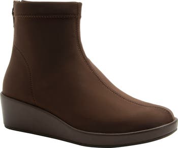 A stretchy shaft and rear zipper add easy wear to a cushioned bootie grounded by a wedge heel and slip-resistant sole.