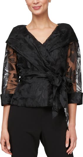 Sheer three-quarter sleeves frame a lovely top showcasing a folded detail that wraps around the shoulders and a chic bow on the belt to complete the look.