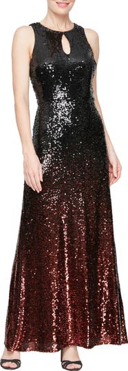 Make the ambient light your perpetual dance partner in this gown drenched in sequins that transition from black at the keyhole-cutout bodice to copper through the trumpet skirt.