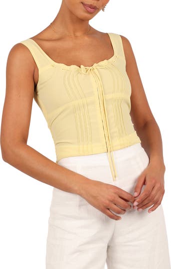 Enchant from every angle in this figure-skimming top sweetened with romantic details—a dainty bow, shirred back panel and pintucked pleats that mimic traditional corset boning.