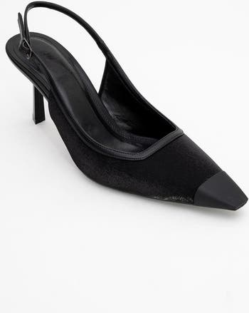A modern slingback pump that balances striking detail with all-day comfort through its adjustable ankle strap and pointed silhouette