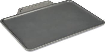 Satisfy a sweet tooth without the messy cleanup with this generously sized cookie sheet with a nonstick finish that releases cookies and gooey treats with ease. The angled handle allows for safely gripping the pan, even while wearing oven mitts, and heavy-gauge aluminized steel promotes heat distribution for even baking and browning.