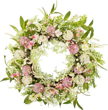 Add a soft touch of nature to your home with our artificial foliage and floral wreath. This artificial spring wreath will add a soft pop of pink with its berries, statice, lavender and allium flowers. It is bursting with long green leaves making it full and luscious. With a light dusting of glitter on the berries and crafted leaves, it provides a touch of sparkle. White thistles, berries, and Hydrangeas complete the wreath. A perfect way to welcome guests and spring to your home than with this life-like wreath. Add the matching garland and floral bouquet for a complete set. Features: Designed with statice, lavender and allium flowers Also accented with pink and white berries Natural twig grapevine backing for hanging Recommended for indoor use only, or covered outdoor use No assembly required - wreath comes in 1 piece Dimensions: 28" diameter (measured from outermost edge to outermost edge across the wreath) Inner wreath: 11" diameter Material(s): polyester/twig/wire/plastic