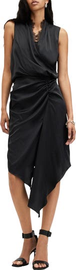 Stretchy satin is draped and gathered to create the asymmetric faux-wrap silhouette of this sleek LBD that s traced with tonal lace at the neckline for a little romance.