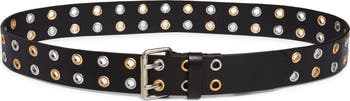 Paired grommets punctuate the length of this leather belt that s just wide enough to add a bold statement touch to your favorite skinnies.
