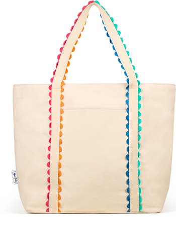 The Nantucket Beach Tote is stylish and functional, made from durable canvas with elegant scalloped edging. With spacious interior pockets, it keeps your beach essentials organized and within reach all day long.