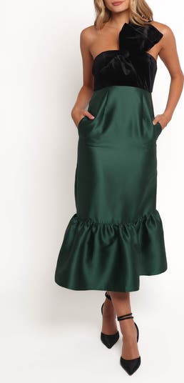 A sumptuous velvet bow-trimmed bodice romances this glamorous gown punctuated with a satiny frilled skirt that moves gracefully across the dancefloor.