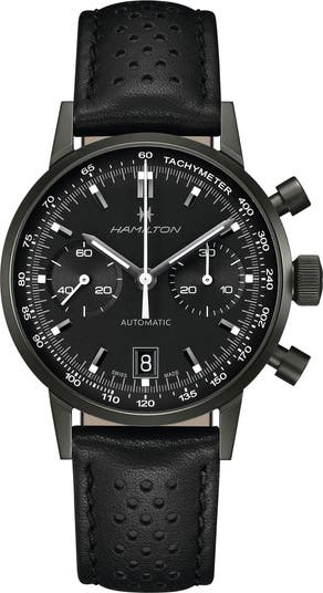 A sleek monochromatic design and perforated leather strap perfectly blend form and function with this Swiss-automatic chronograph detailed with a date window at the six-o clock hour.