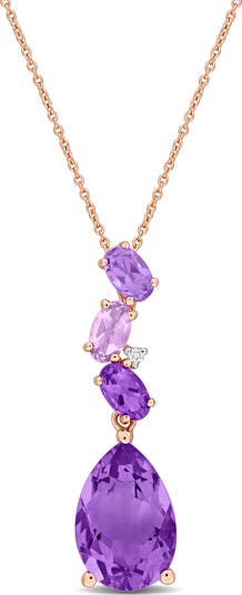 This beautiful necklace features amethyst and rose de France gemstones accented with diamonds and set in 10k rose gold, this pendant hangs on a 17-inch chain. The soft hues of the gemstones, combined with the warm rose gold, offer a romantic and feminine appeal. The diamond accents add just the right amount of sparkle, making this pendant a captivating choice.