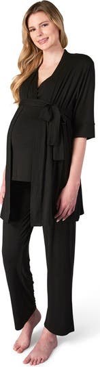 This soft and stylish 3-piece gift is the perfect sleep and loungewear set for pregnancy, hospital and home. The maternity/nursing top has cross-over chest that pulls aside for easy discreet nursing after baby arrives, while the pant has a stretchy, smocked waistband that fits just under the belly. Throw on the 3/4-sleeve short robe as a stylish cover up when family and friends visit.