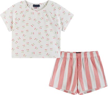 A sweet cherry-print top contrasts with awning-stripe shorts in a comfy cotton-jersey pajama set ideal for warm nights.
