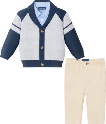 Little ones will look cute and coordinated in this three-piece set that features a cozy cardigan, a dapper long-sleeve shirt and polished pants that have a stretchy elastic waist.