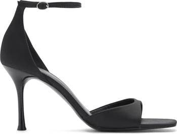 A minimalist profile and square toe distinguish a two-piece satin sandal lifted by a tapered stiletto heel and secured with an adjustable buckle closure.