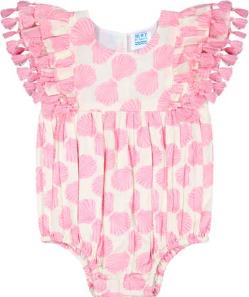 Flutter sleeve romper in a sophisticated print with tassel detailing, and snap bottom closure.