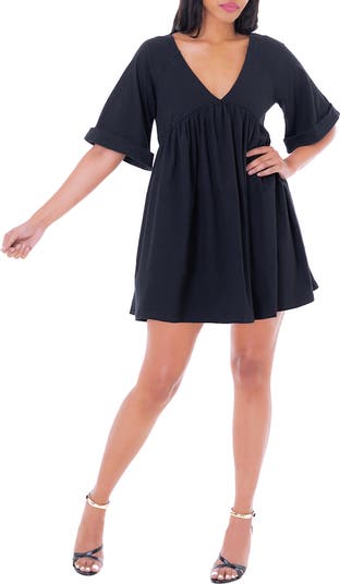 A deeply dipped neckline fronts this flouncy flared dress framed by elbow-length sleeves.